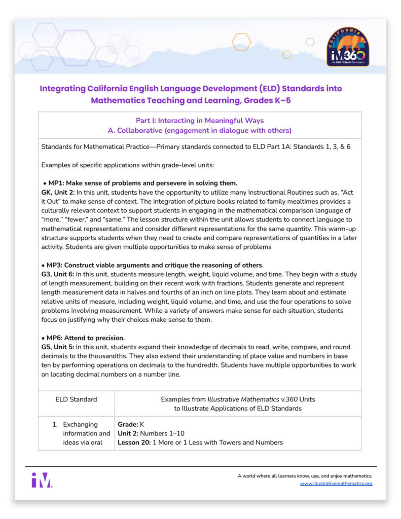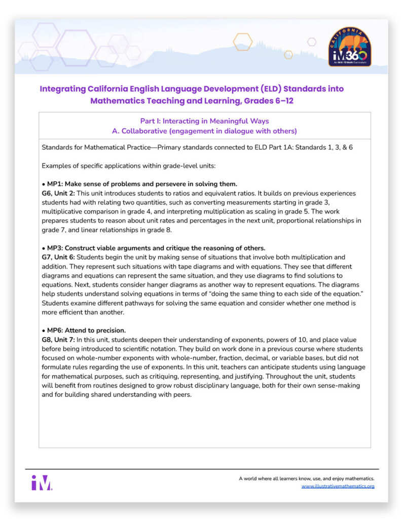 California IM v.360 includes direct correlations to the California English Language Development (ELD) Standards. Educators will find these supports in the Advancing Mathematical Language and Access for English Learners section of each Course Guide, making it easier to integrate math learning and language development.