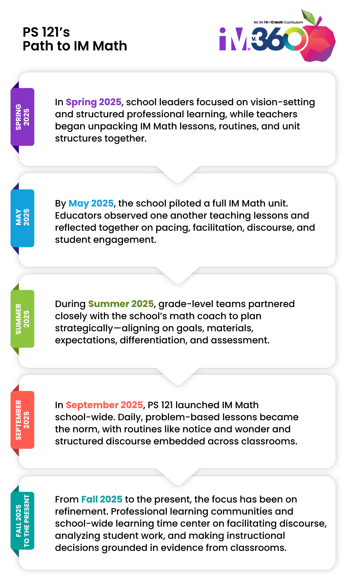 District 11’s math journey began in 2019 and has been shaped by intentional curriculum selection, aligned professional learning, and sustained, visionary leadership at both the district and school levels. PS 121’s implementation of IM Math reflects the district’s long-term commitment to coherence and continuous improvement.