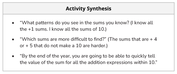 During the activity synthesis of this lesson, teachers name the year-long fluency expectations for addition within 10, and support students in reflecting on the facts they know and the facts they still need to practice. This process supports students in building positive math identities and encourages them to connect new learning to what they already know.
