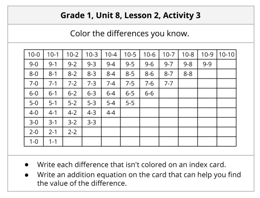 Over time, after a variety of experiences where they have shared their developing thinking, learned new facts, and practiced relating more complex facts to simpler ones, students begin to know more facts. Throughout Units 4–8 in our Grade 1 course, students continue to practice their addition and subtraction facts during centers and warm-up activities. They also have multiple opportunities to reflect on which facts they know and which facts they are still learning. The example below shows this practice continuing through the final unit of the course. In Lessons 1 and 2 of Unit 8, students make note of the sums and differences they know from memory, and create cards to practice the facts they don’t know yet.