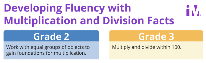 By the end of grade 3, students develop fluency with multiplication and division facts within 100. As shown in the table, the process of developing this fluency begins in grade 2 as students work with equal groups and arrays.