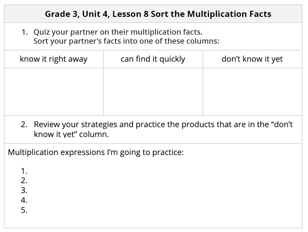 During Unit 4, students sort facts cards and reflect on the facts they know right away and the facts they are still working on. They continue to use these cards throughout the year to intentionally practice their facts and monitor their own progress. (Read more about how students come to know their multiplication facts in this post.)